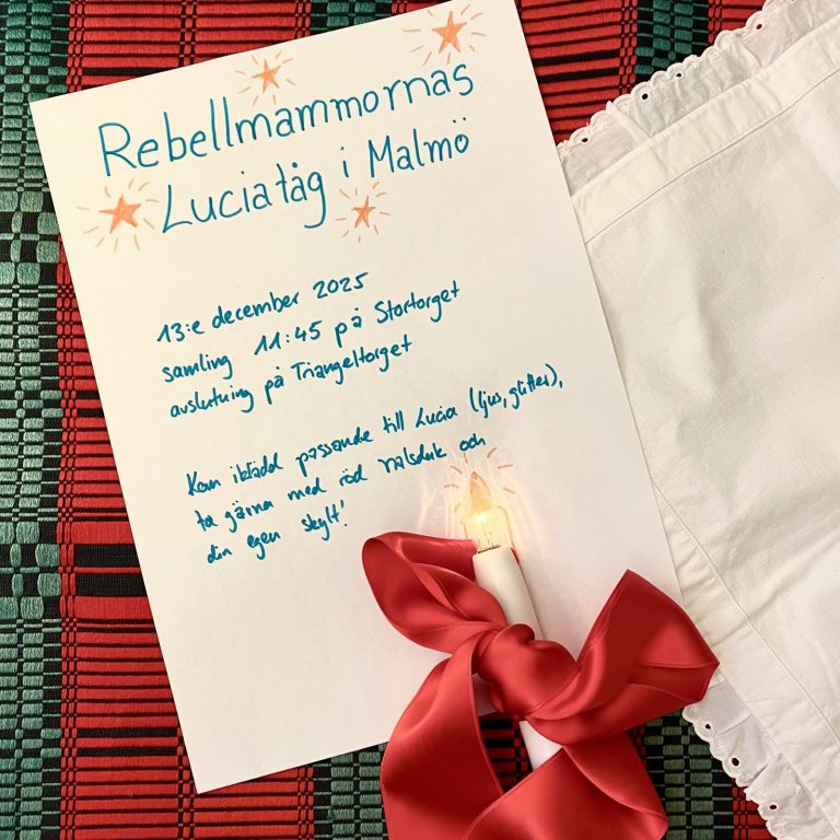 Stortorget, Malmö Kom och fira Lucia med Rebellmammorna! Datum: 13:e december 2025Samling: kl. 11:45 på Stortorget (Malmö)Manifestationen börjar: kl. 12Avslut: Ca. kl. 13 på Triangeltorget (Malmö) Vi tågar genom gågatan, sjunger luciasångar om klimatet och ska möta alla andra fantastiska Rebellmammor. Dessutom blir det en liten överraskning! Med vår manifestation vill vi uppmärksamma att Parisavtalet […]