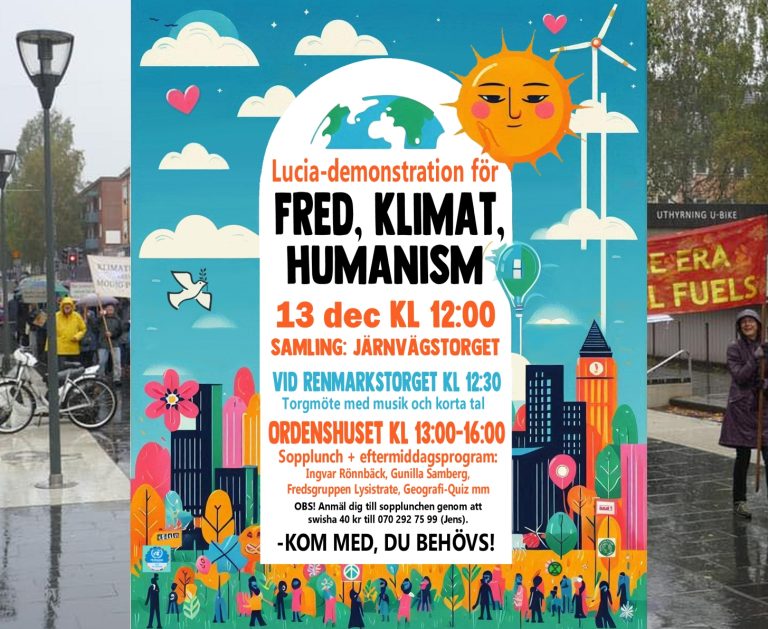 Järnvägstorget, Umeå #LuciademonstrationSamling på Järnvägstorget 12.00ca 12:15 avmarsch12:30-13:00 på Renmarkstorget: – korta tal eller dikter från några av de deltagande organisationerna. Musikinslag med Ingemar Jämte och Maria Johansson.13:00-16:00 på Ordenshuset, Sopplunch + eftermiddagsprogram:Ingvar Rönnbäck, Gunilla Samberg,Fredsgruppen Lysistrate, Geografi-Quiz mmFikapaus med kaffe och kaka ingår.Anmälan till Sopplunchen: swisha 40 kr till 070 292 75 99 (Jens) […]